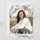 Graduation photo announcement with botanical, branches and leaves design. Add her photo to the front of flat cards that come printed, or with the option to download. Her name and "class of" at the bottom is in a modern script in purple over ecru. Announcement and / or party information is added to the back of the stationery and is also framed by green branches and blue - purple flowers.