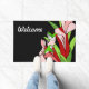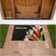 Welcome mat with pink flower design and stylised hummingbird on a black background