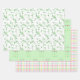 This spring-themed assortment of wrapping paper includes green on white ferns, a colourful spring plaid on white and flowers in triplicate on a pastel green background.