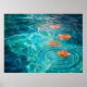 The image shows a serene scene of orange flowers floating on the surface of clear, turquoise water. Concentric ripples emanate from each flower, creating a dynamic pattern on the water's surface. The water reflects light, creating a shimmering effect with varying shades of blue and green. The overall mood is peaceful and tranquil, evoking a sense of calm and natural beauty.