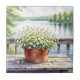Pretty tile with a beautiful illustration of white flowers in a copper pot with a back view of a serene lake with pine trees.