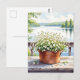 Pretty postcard with a beautiful illustration of white flowers in a copper pot with a back view of a serene lake with pine trees. Keep in touch with a friend or family member with this beautiful postcard.