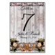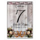 Design features a barnwood background with burgundy ribbon, lace, knotted horseshoes and wildflower bouquets at the bottom with a place for the table number, couple's name and wedding date. Designed to coordinate with "Gettin' Hitched - Horseshoes, Ribbon & Lace" Collection. To change details, click «Personalise». To move the text or change the text size, font, or colour click «Click to customise further»