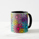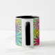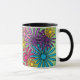 This mug has a Bauhaus design of a mix of flowers in pinks, purples, blue, and yellow on a field of green.