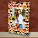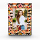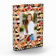 Autumn flowers on top of black and white stripes sprinkled with gold dots pattern highlights your favourite photo on this acrylic photo block. Great as a gift or to display your favourite photo in your own home.