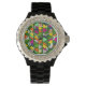 This watch has a mid-century modern design of overlapping triangles in flowery colours running vertically on a field of green.