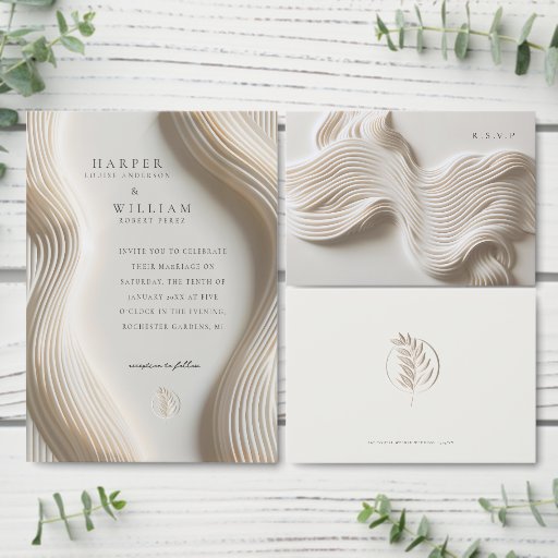 Elegant flowing ivory wedding invitation featuring a contemporary design with graceful curves. Perfectly crafted to invite your guests to a special celebration, this invitation combines modern sophistication with timeless charm, making it an ideal choice for your wedding day.