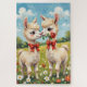 This whimsical illustration captures two fluffy Alpacas wearing matching red bows and standing nose-to-nose in a meadow, with one shyly holding a rose. A charming and cuddly Valentine's Day gift for animal lovers.