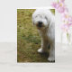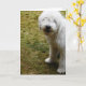This dog has tons of fluffy white curly hair like a mop covering its eyes. Possibly a labrador poodle cross or Labradoodle. Colour photograph. Customise with your own funny saying or enjoy as shown.