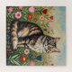 Grey striped cat sitting in a patch of colourful folk art flowers. Cute grey striped cat puzzle for cat lovers.