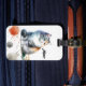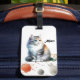 Cat enthusiasts will adore this charming luggage tag showcasing a long-haired, fluffy, multicolored cat with striking blue eyes. The bottom is adorned with a border of paint splotches for added visual appeal. The word 'meow' is customisable and can be altered or omitted according to preference.
