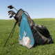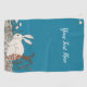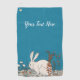 This golf towel is blue with a fluffy white rabbit sitting on a grey ground among white and orange flowers. Customise your text with the template.