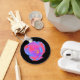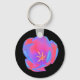 This pretty keychain features a beautiful photograph of a tulip. The photograph has been artificially coloured resulting in a fluorescent tulip. The outer petals are coloured with shades of blue and red, while the inner petals show shades of pink and purple. The very centre of the flower is bright yellow. The simple black background shows off the stunning beauty of this flower.