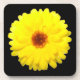 This awesome cork coaster features .a photo of a pretty fluorescent yellow marigold flower on a black background.