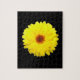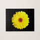 This awesome puzzle features a photo of a pretty fluorescent yellow marigold flower on a black background.