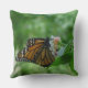 Pretty Monarch butterfly with its orange and black wings and white dots sitting on pink/white Geranium flowers. The word Love is written in black text on front of square throw pillow. Original Photography © TamiraZDesigns.