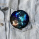 Fabulous, glowing, blue and yellow, night butterfly on dark background.
