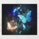 Fabulous, glowing, blue and yellow, night butterfly on dark background.