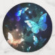 Fabulous, glowing, blue and yellow, night butterfly on dark background.