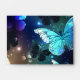 Fabulous, glowing, blue and yellow, night butterfly on dark background.