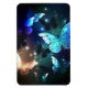Fabulous, glowing, blue and yellow, night butterfly on dark background.