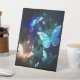 Fabulous, glowing, blue and yellow, night butterfly on dark background.