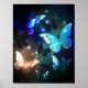 Fabulous, glowing, blue and yellow, night butterfly on dark background.