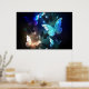 Fabulous, glowing, blue and yellow, night butterfly on dark background.