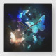 Fabulous, glowing, blue and yellow, night butterfly on dark background.