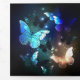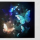 Fabulous, glowing, blue and yellow, night butterfly on dark background.