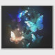 Fabulous, glowing, blue and yellow, night butterfly on dark background.