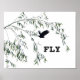 A black bird flies off its willow branch. A simple image in near silhouette. Choose your own background colour.