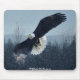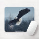 A giant American Bald Eagle flies through a sudden snow storm. This image features as one of many in our "Beautiful Birds" Art and Photo Collection of high-quality Mousepads.