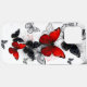 Flock of flying, realistic, red and black morpho butterflies on white background with drops of paint.