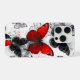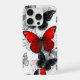 Flock of flying, realistic, red and black morpho butterflies on white background with drops of paint.