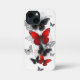 Flock of flying, realistic, red and black morpho butterflies on white background with drops of paint.