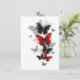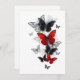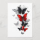 Flock of flying, realistic, red and black morpho butterflies on white background with drops of paint.