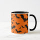 Mug in a fun and spooky design featuring cartoon-style black bats with glowing red eyes flying across a bold orange background, making it perfect for Halloween-themed decor or party supplies. It’s playful, a little creepy, and full of Halloween spirit!