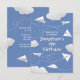 This fun paper aeroplane themed birthday party invitation card for an aspiring aeronautical engineer features various illustrated folded white paper aeroplanes with whimsical curvy dashed-line flight trails amongst puffy white clouds on a customisable blue background - personalise with your party details - by katz_d_zynes