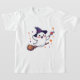 This adorable Halloween t-shirt features a cheerful cartoon ghost wearing a dark blue witch hat with a purple band, flying on a broomstick, and holding a glowing lollipop. Surrounded by orange and purple starbursts, this fun design brings a playful Halloween vibe that kids will love. Perfect for trick-or-treating, parties, or everyday spooky fun!
