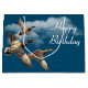 Three mallard ducks flying and white clouds on a blue background for a birthday.
