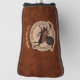 A leather patch bearing the logo of mythical Flying Moose Aviation in Talkeetna, Alaska as worn by the company's bush pilots. Features a winged moose superimposed on a circle with text reading "FLYING MOOSE AVIATION," "TALKEETNA, AK" and "ESTD 1957." Add your own additional text. Everything is superimposed on a brown leather background image. Flightseeing, glacier landings, cargo, hunting and fishing charters. We fly, tell us where you want to go.