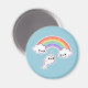 Super cute baby narwhal flying under a sparkle rainbow with happy clouds.