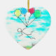 Cartoon character using balloons to fly over the city. Colourful digital image.