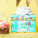Cartoon character using balloons to fly over the city. Colourful digital image.