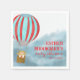 Paper napkin for a baby shower features a cute cub in a hot air balloon flying above the clouds describing the journey for the baby to come.
