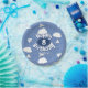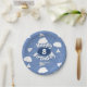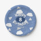 This whimsical paper plate for a boy's or girl's birthday party features various illustrated folded white paper aeroplanes with dashed-line flight trails amongst puffy white clouds on a customisable blue background - personalise with your child's name & age - by katz_d_zynes