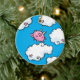 A hanging ornament featuring a digital cartoon pink pig with little white wings, dances on clouds embellished with hearts up in the bright blue sky.