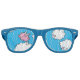 Sunglasses featuring a digital cartoon pink pig with little white wings, dancing on clouds embellished with hearts up in the bright blue sky.