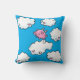 A lovely squishy Pillow featuring featuring a digital cartoon pink pig with little white wings, dances on clouds embellished with hearts up in the bright blue sky.